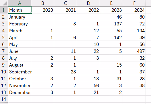 The data must be arranged in the same columns and rows as in the sample.