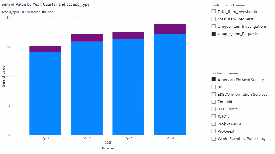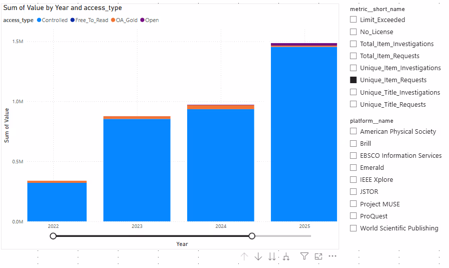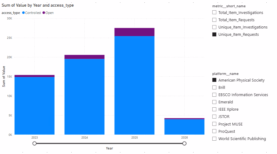 This template is designed to help you visualize how library resources are used over time, specifically categorized by their Access Type. It allows you to see the balance between the material that is only available to authorized users and the content available as Open or Free To Read.