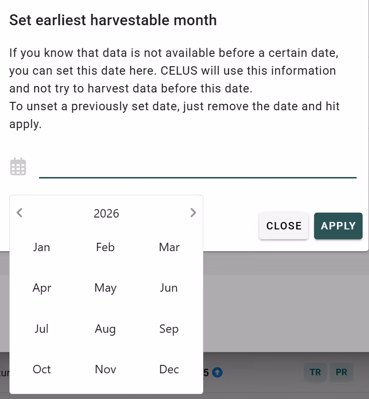 In CELUS, you have the ability to specify a point in time beyond which data becomes unharvestable. This typically happens when publishers cease supplying historical data for months starting from a particular date. Once you set the "Last Harvestable Month" in CELUS, the system discontinues its automatic data retrieval efforts for periods preceding this specified month.