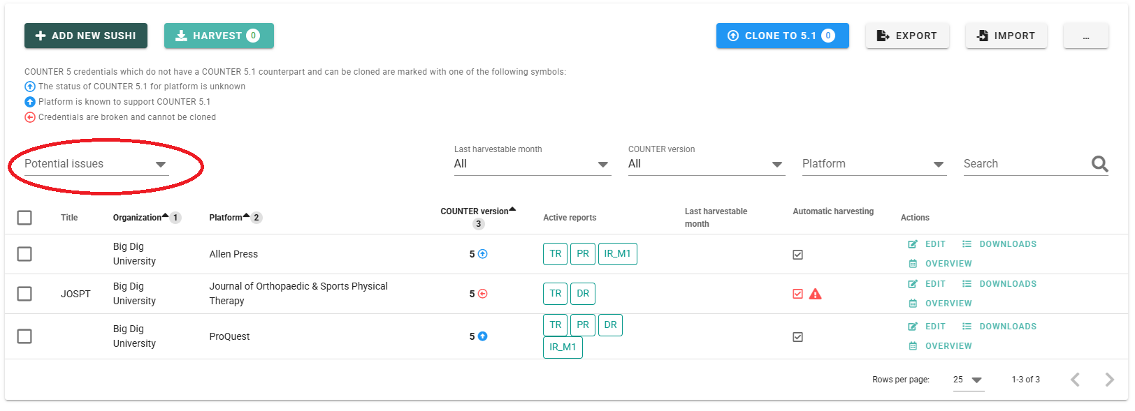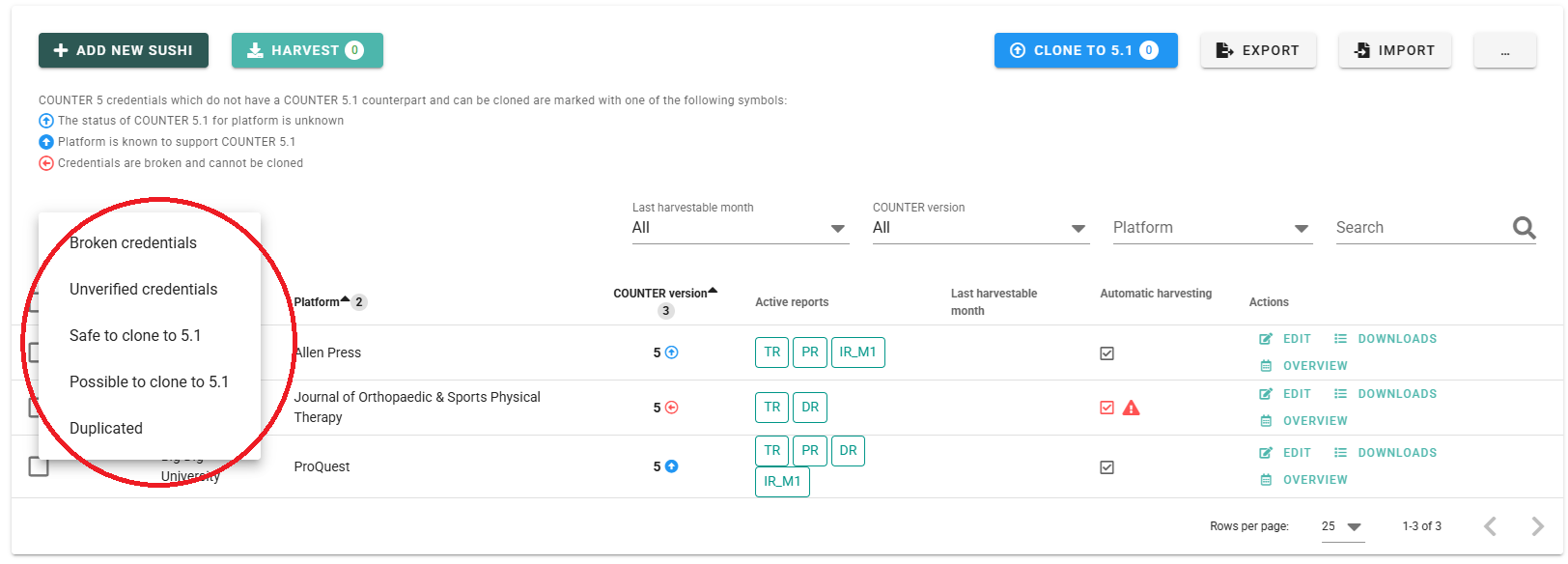 1. Go to "SUSHI Management" in the left side menu and choose the SUSHI credentials which you want to clone. Credentials, which can already be safely cloned and used for harvesting are marked with a bold blue arrow next to the COUNTER Version number. These publishers are already providing the new reports, as verified by our community.