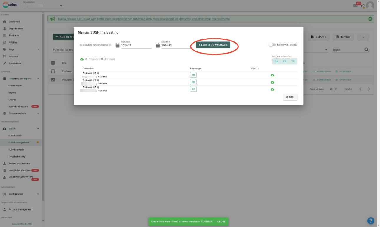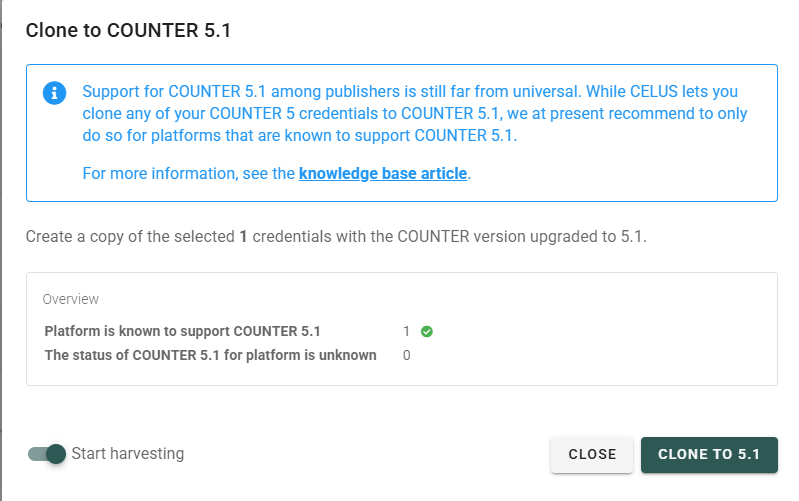 To help our users seamlessly transition to COUNTER version 5.1, CELUS provides the option to clone your existing COUNTER 5 credentials with an automatically updated SUSHI URL. Please note that the cloned credentials will only function for publishers already offering COUNTER 5.1 reports.