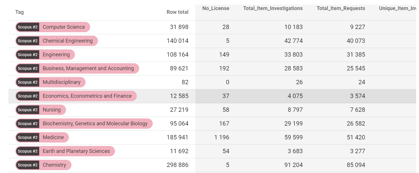 Unlike in COUNTER reports, you can only choose one attribute to be listed in the rows of your report in CELUS. In most cases, this is going to be a Title/database. This is how your report will look like with Titles/database chosen as Rows: