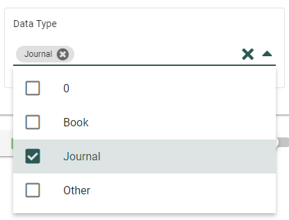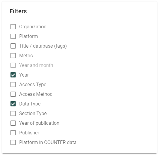 Just like selecting columns, you have the freedom to choose as many filters as you need (don't be shy. You know you want to). Once you check the boxes here, the filtering settings corresponding to your selections will appear below. You can see that in our example, we have chosen to filter Year and Data type. In the filter settings below, we can now see our options for Data Type and Year. For our example report, we are going to choose Data Type "Journal" and the year 2023.