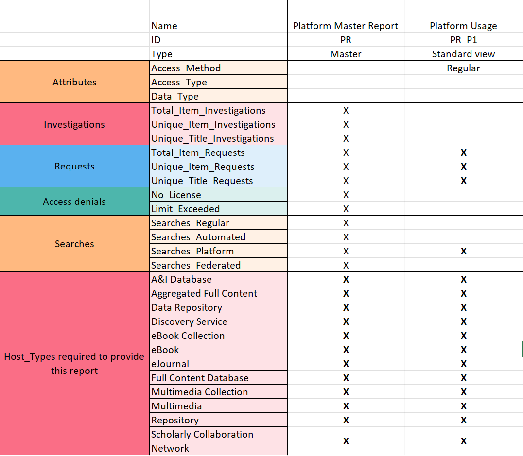 PR report only has one standard view - Platform Usage - PR_P1, which provides platform usage summarized by Metric_Type.