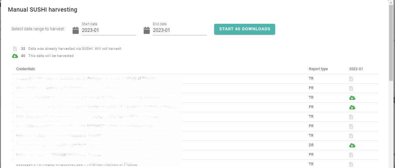 Click on Harvest, the following dialog opens, where you can choose the months you want to harvest data for (in case you want to harvest data for only one month, make the start date and end date the same, e.g. 2022-06) and click on the "Start xx downloads" button.