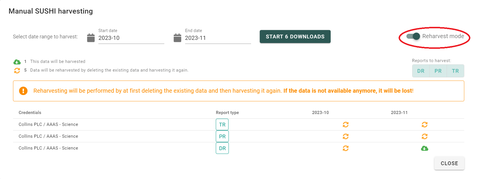 3. In the following dialog, enable the "Re-harvest mode" slider, choose the start and end month to re-harvest and click on the "Start downloads" button: