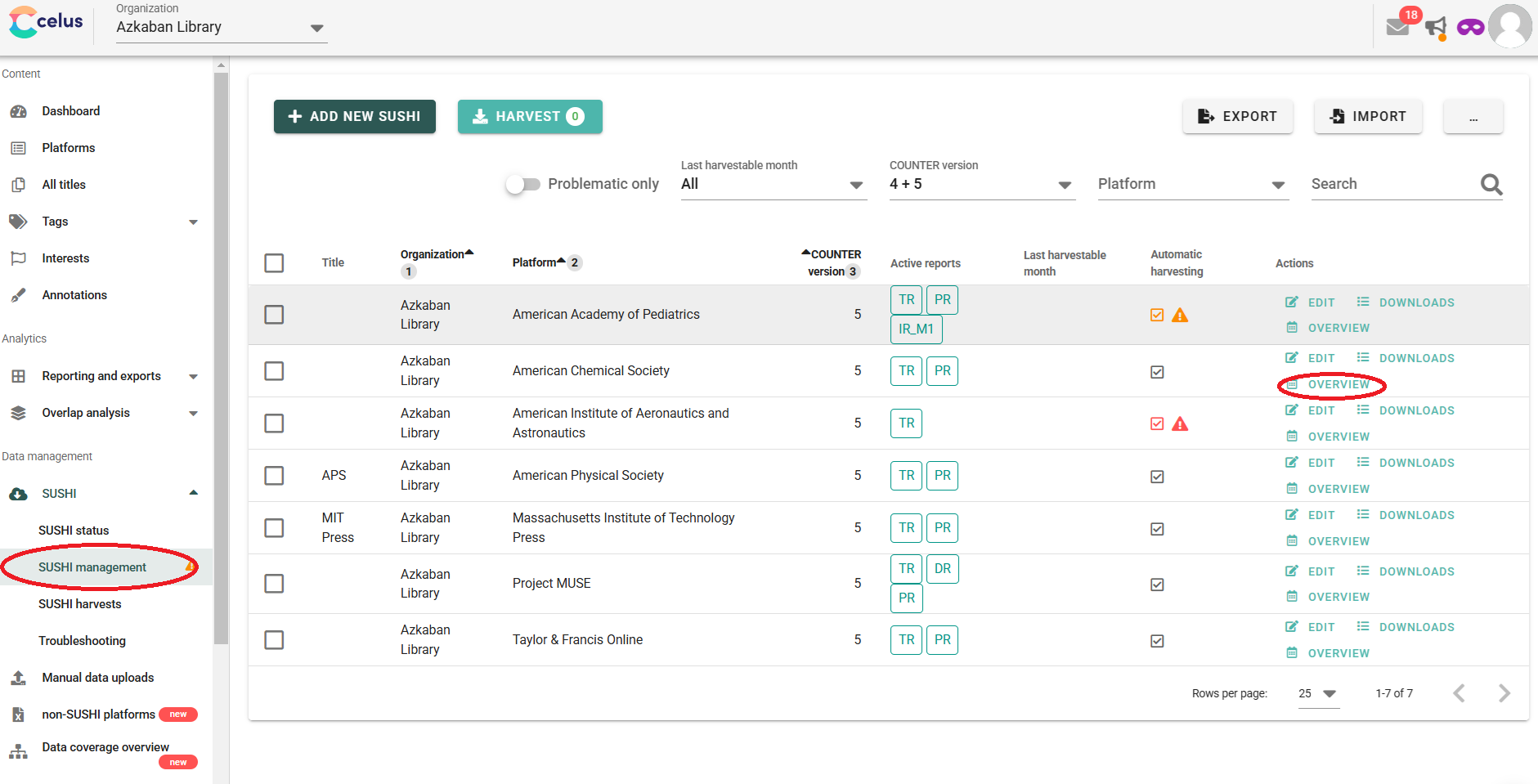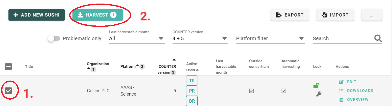 1. In SUSHI Management, click on "Overview" in the row of the affected platform: