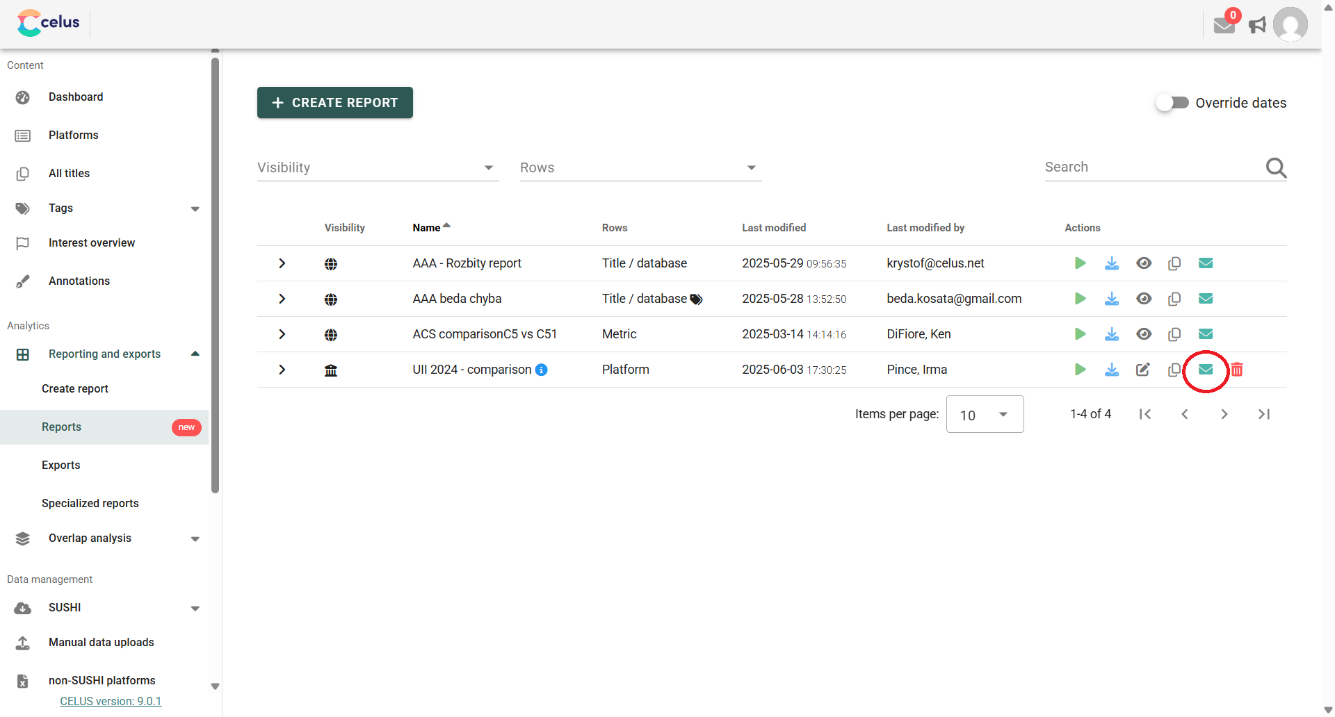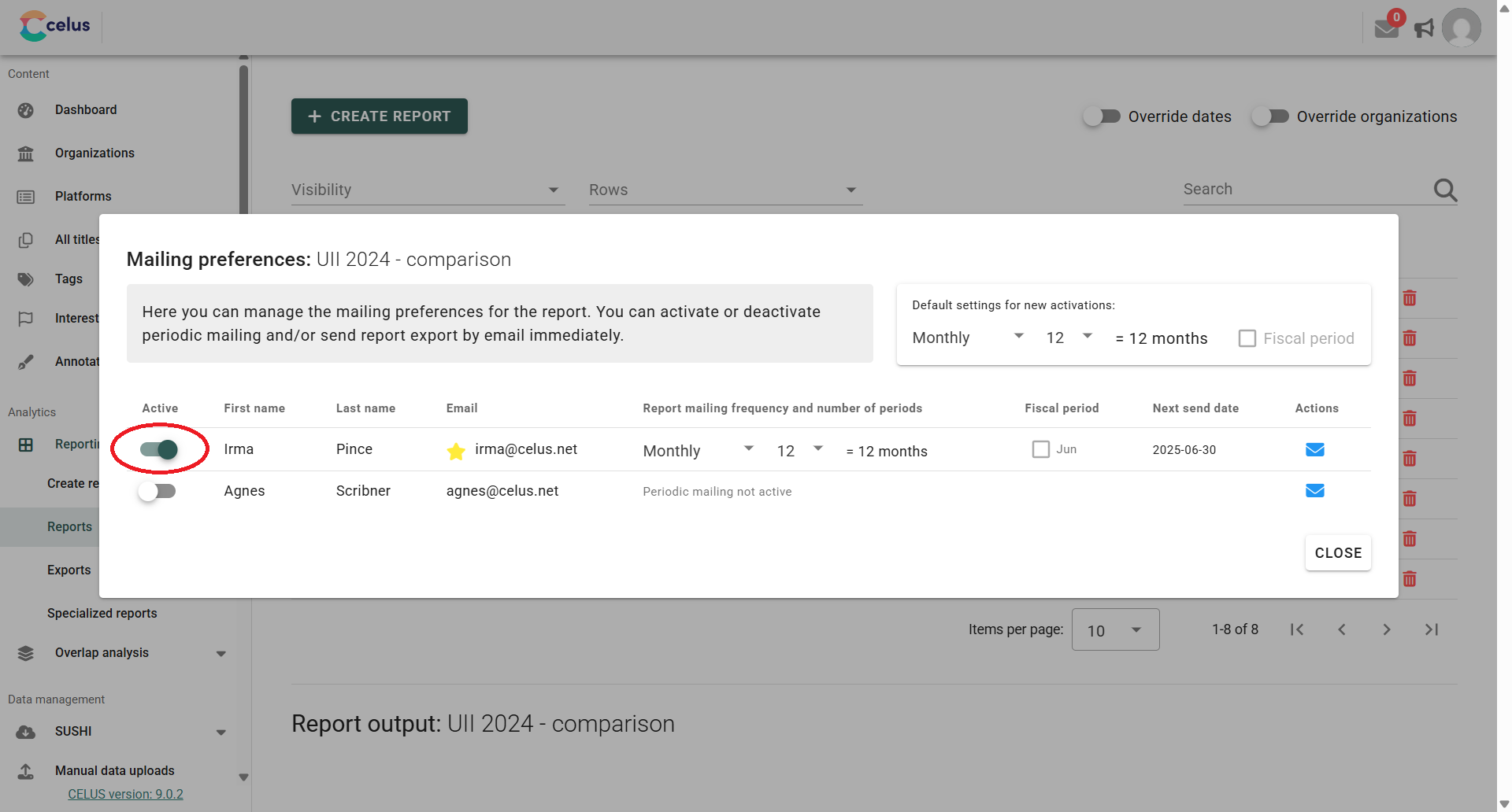 The Scheduled Report Emails feature in CELUS allows you to set up automatic email delivery of your reports to yourself or, for administrators, to your colleagues. This ensures recipients receive reports at a chosen frequency for a specified time period without manual intervention.
