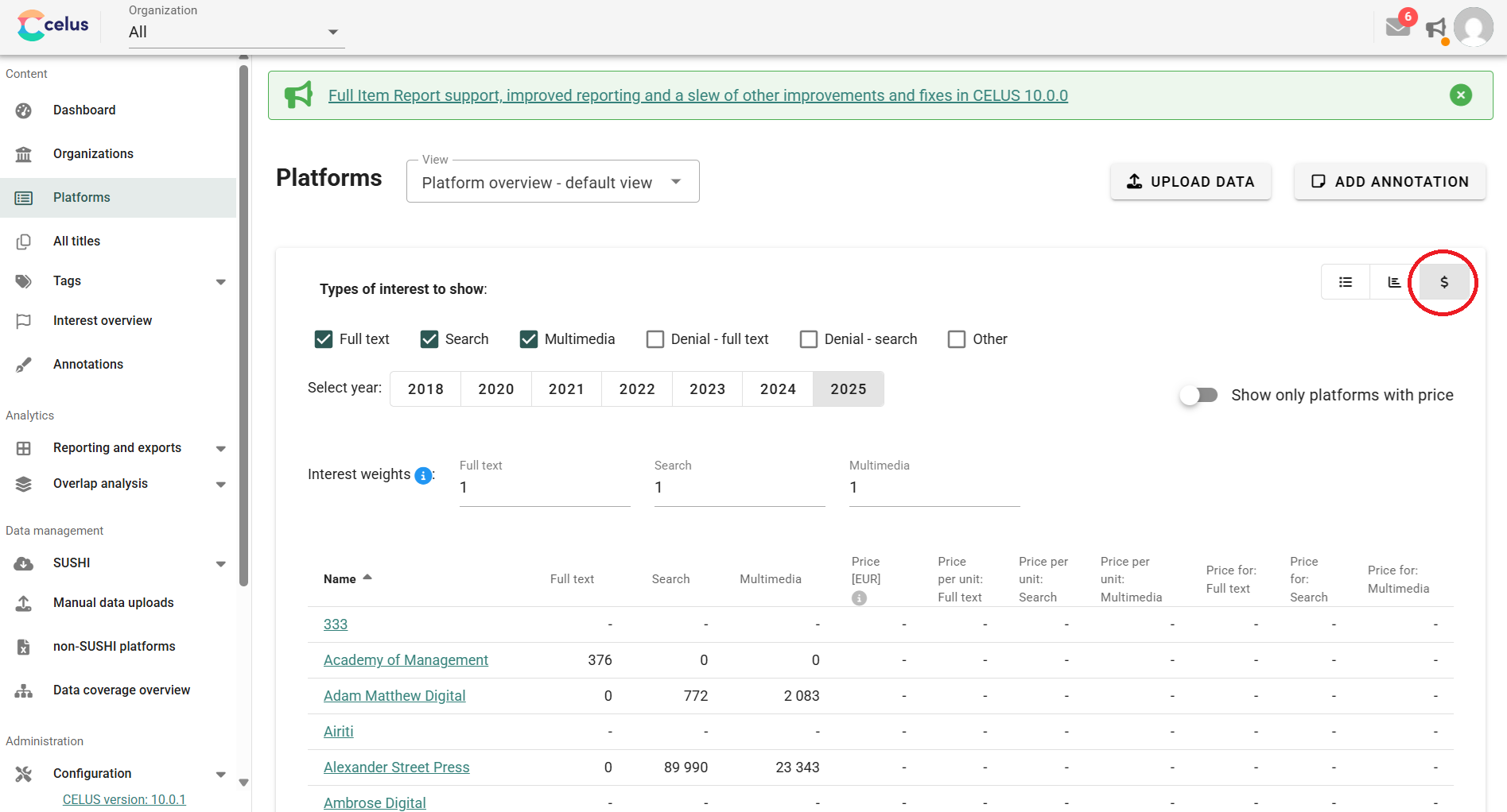 Cost per use functionality is "hidden" on the Platforms page under the dollar sign in the upper right corner (see screenshot below). However, it is only a very basic module, where you have to add costs manually and it only calculates cost-per-use at the platform level, so you cannot add costs of individual journals or collections. The other option is to use CELUS - ConsortiaManager integration (assuming you are a Consortia Manager customer). If so, you can then take a deeper look at CPU in Consortia Manager interface, to which CELUS supplies the usage stats.