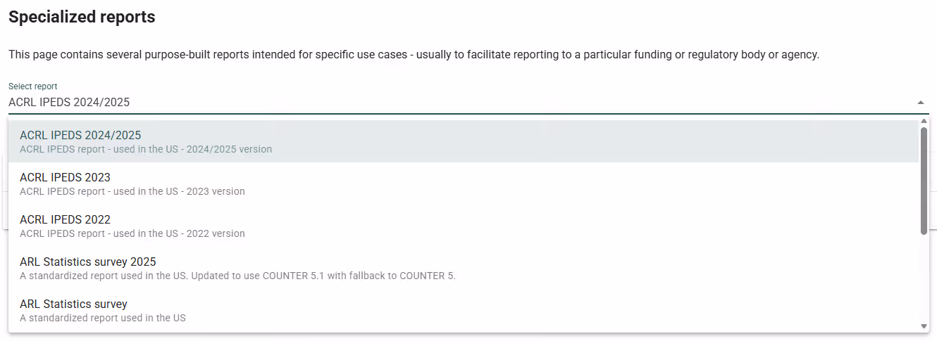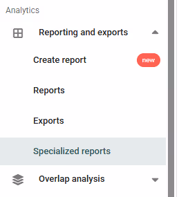 You can access the specialized reports by clicking on “Reporting and exports” → “Specialized reports” in the left-side menu: